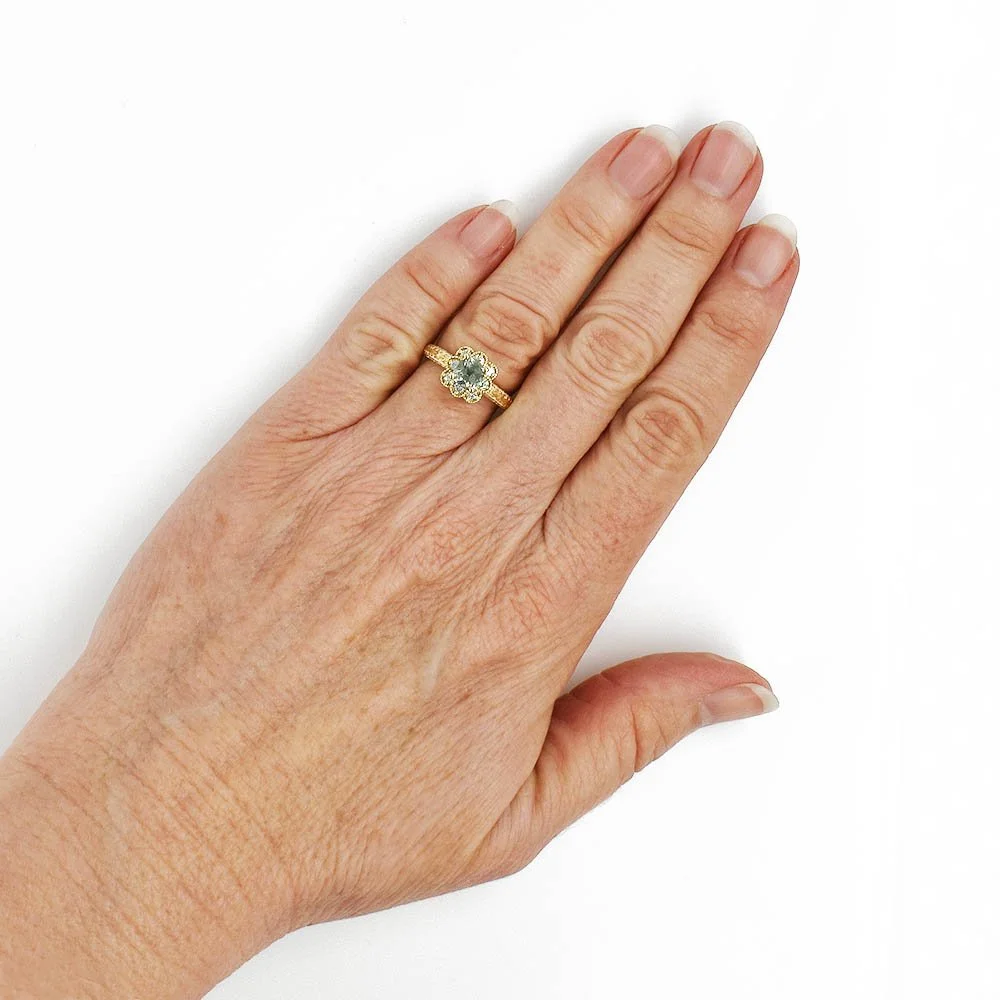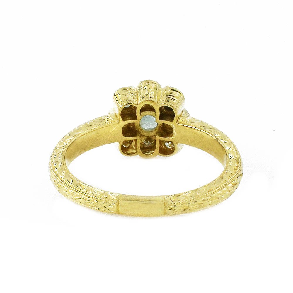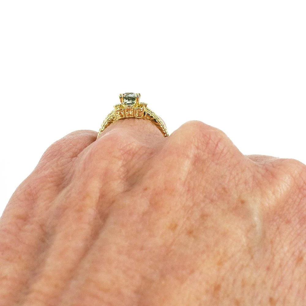 This is a new ring with old world detailing. Engraving and milgraining adorn the design that features a color change Alexandrite surrounded by diamonds. The Alexandrite has a Gemological Institute of America report that illustrates the color change and authenticates the gem. In different lighting, the Alexandrite will change like a chameleon from yellowish green to purplish gray. It will be so fun to see which color appears as you go through your day!