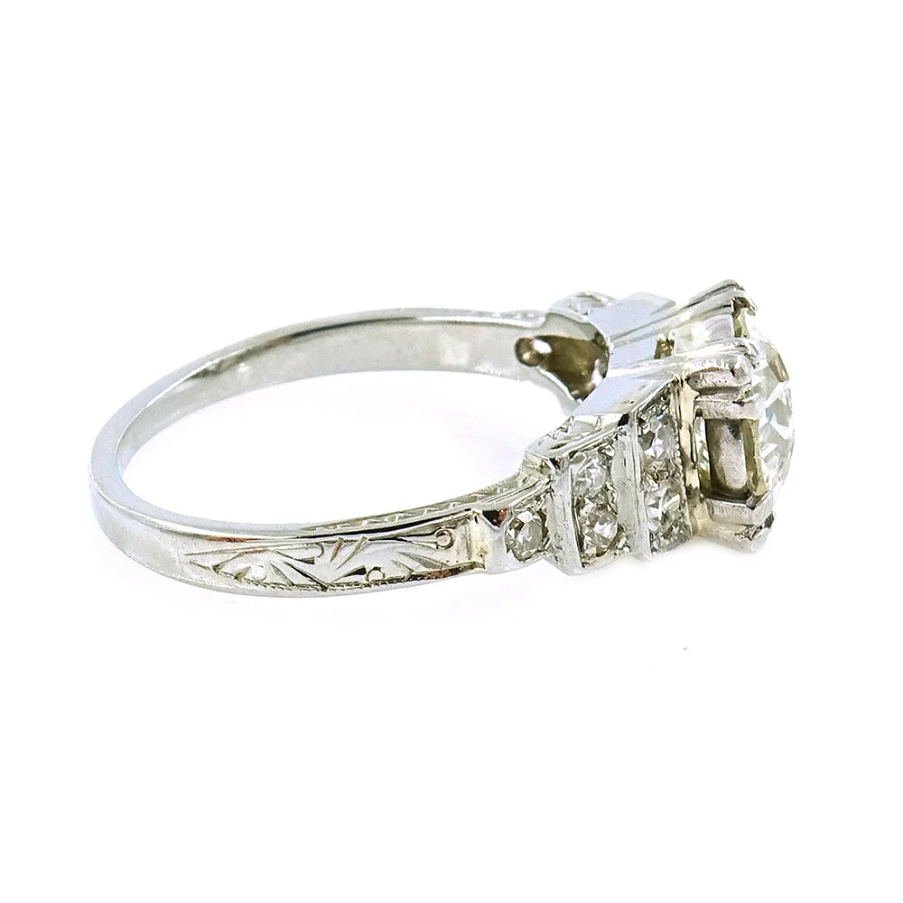 Pop the question with this gorgeous antique ring. Using an antique engagement ring like this one blesses the union between you and your partner by bringing the longevity that this ring has experienced for almost a hundred years. The center stone is original to the ring as the stairstep shoulders shimmer with complimentary diamonds. The delicately engraved shank completes the design.