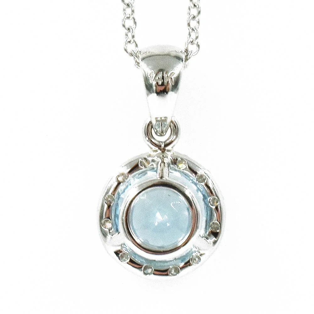 Classy and delicate, this exquisite brand new pendant features a round aquamarine enhanced by a halo of diamonds accenting its beauty. Lovely to wear everyday or for special occasions, it would look gorgeous on you!