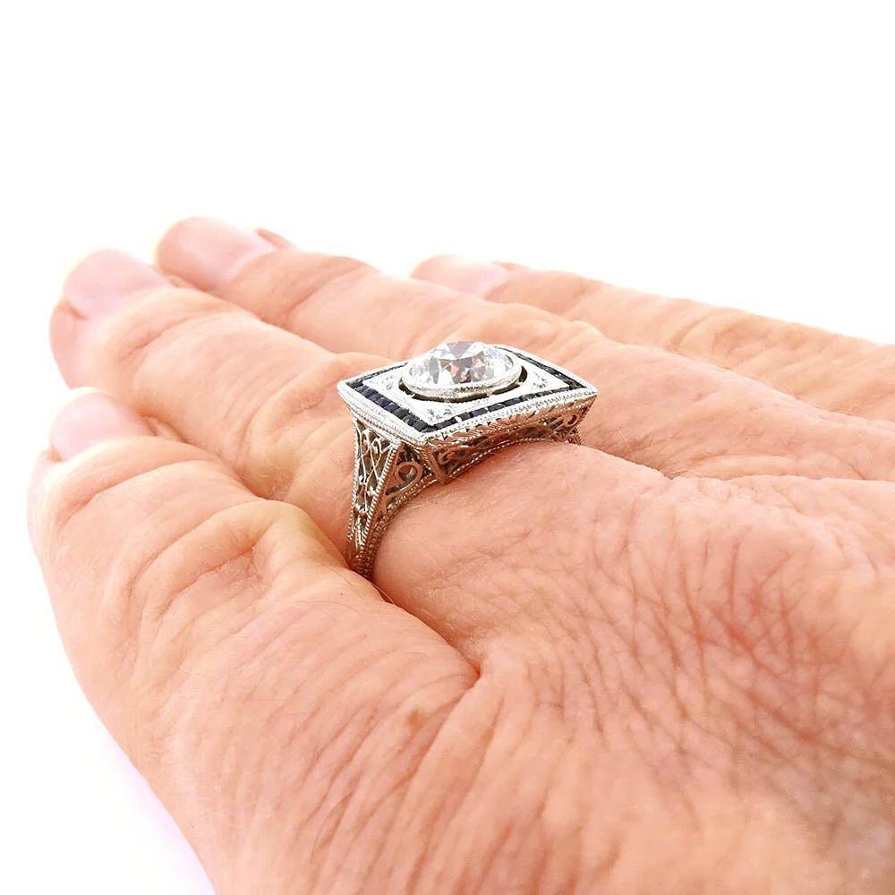 A stunning Old European cut 1.10 carat round diamond is set in a classic square Art Deco setting with blue sapphire border. Milgrain and engraved detailing accompanies the filigree to create a spectacular look. One caveat of wanting a large diamond is that it usually has to to sit up high on the finger, however the way this diamond is set, it sits lower and therefore, easier to wear.