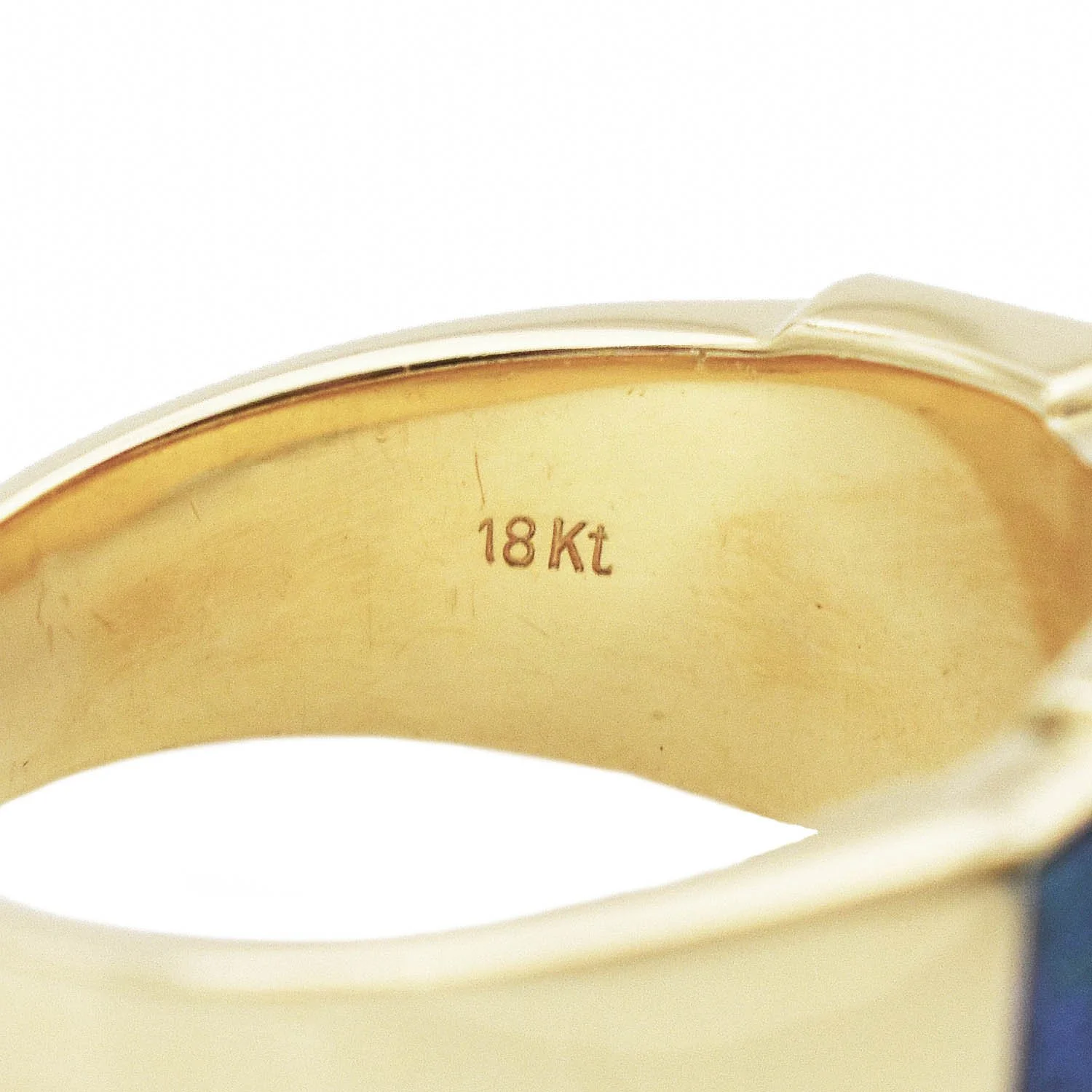 A wide band of yellow gold is inlayed with various elongated triangles and rectangles of black opal in this bold, vintage ring. A stripe of diamonds accent the composition, adding sparkle to the asymmetrical design. The alluring blue and green opals will inspire and delight anyone who adorns this spectacular beauty!