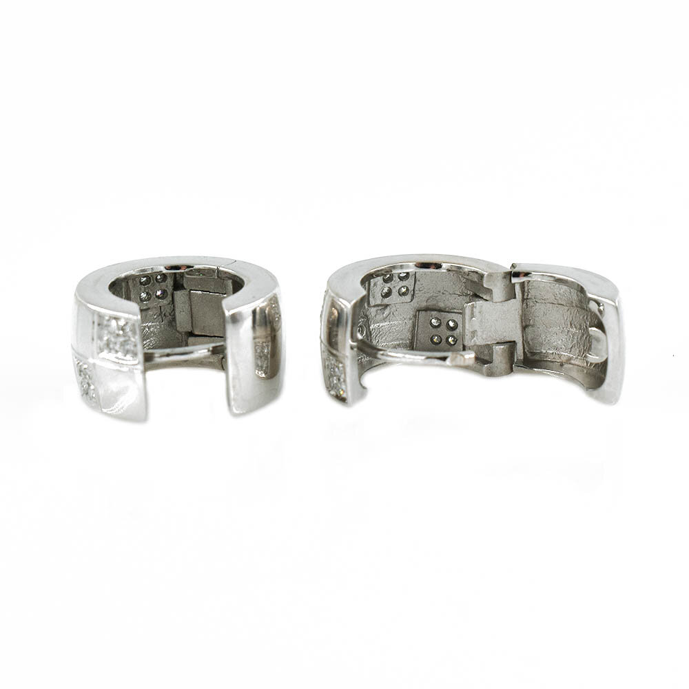 Indulge your playful side with these ample, estate huggie earrings with a checkerboard pattern of diamonds and polished gold squares. Their width makes them feel substantial, but their diameter is the perfect size for everyday wear. The diamonds are on the front with the backs just polished gold, so you could flip them for a simpler look. Two looks for the price of one! Marked “FB,” these earrings were most likely created by Flyer Bros. Inc. of New York City, USA. Flyer Brothers was founded in 1950s.
