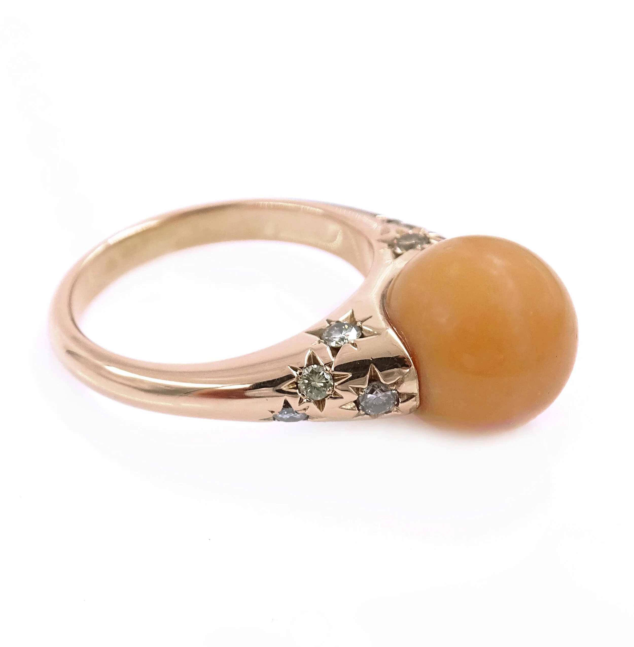This distinctive ring showcases a salmon colored coral sphere complimented on either side by diamonds, in a variety of sizes, flush set in the stars. Its high profile commands the attention it deserves. Add this eye-catching beauty to your collection today!