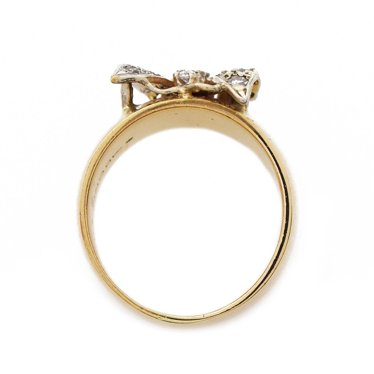 A wide, polished yellow gold band ring is adorned with a white gold, diamond encrusted butterfly in this shimmering vintage ring. The dainty butterfly has “landed” gracefully on the band and playfully seems as if it could flutter away at any moment. Capture it while you can!