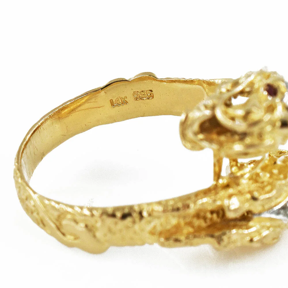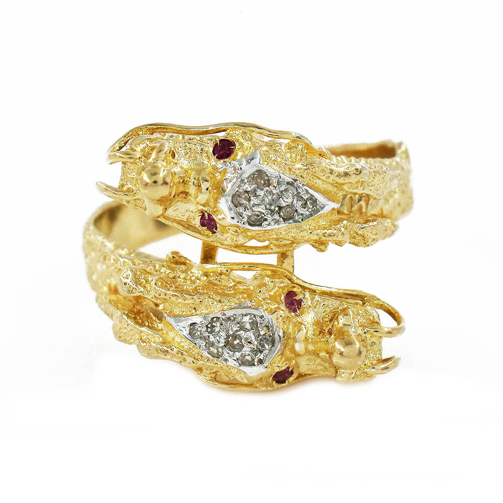 A pair of smiling dragons are featured in this estate bypass ring. Shimmering diamonds adorn their heads and ruby eyes glint with mystery. In Chinese culture, dragons traditionally symbolize potent and auspicious control over water, rainfall, typhoons, and floods. The dragon can also be a symbol of power, strength, and good luck for people who are worthy.