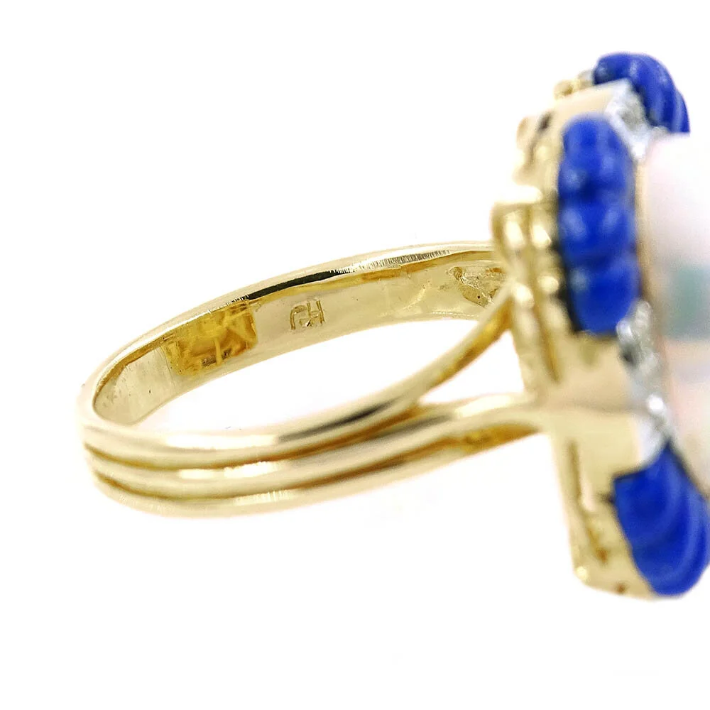 A large Mabe pearl is artfully accented with carved lapis lazuli and white diamonds in this distinctive statement ring. The vibrant blue of the lapis is a dynamic contrast to the luster of the pearl and the shimmer of the diamonds.
