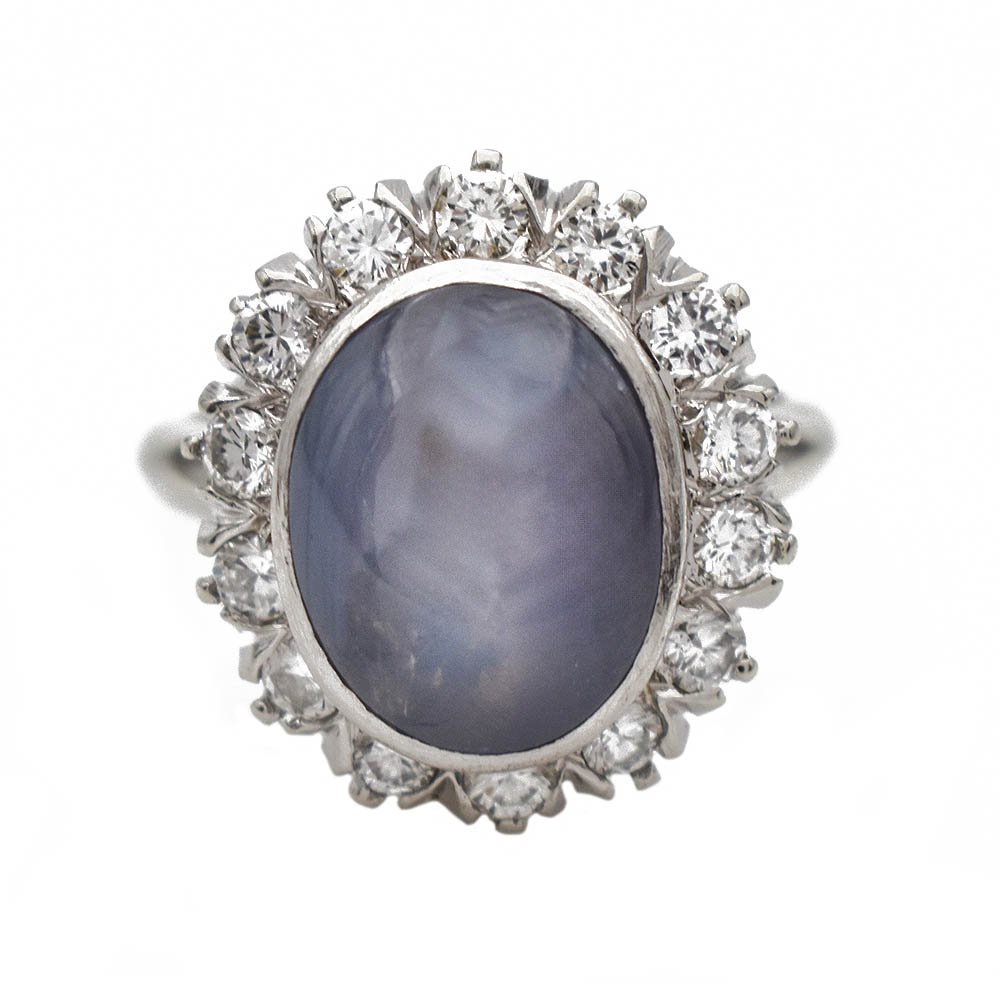 Mid-Century Star Sapphire and Diamond Cluster Ring