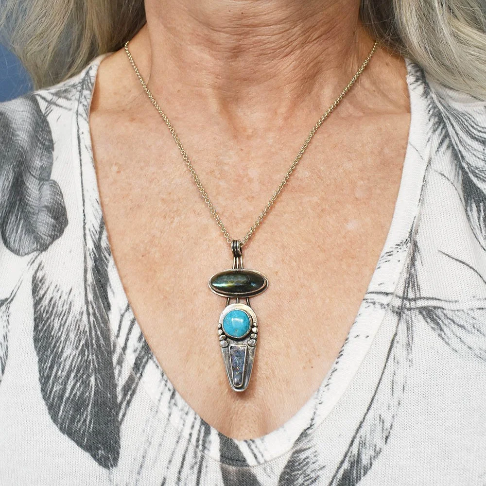 With Modernist flair, this pendant features labradorite, turquoise and boulder opal bezel set in a symmetrical design. Although subtle in color, the pendant makes a bold statement. The cable link chain that is included supports the stature of the piece without being over-powering.