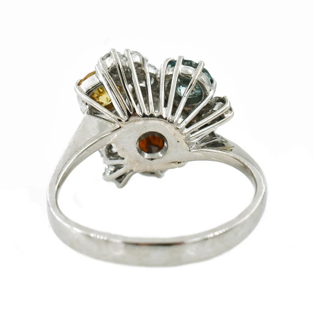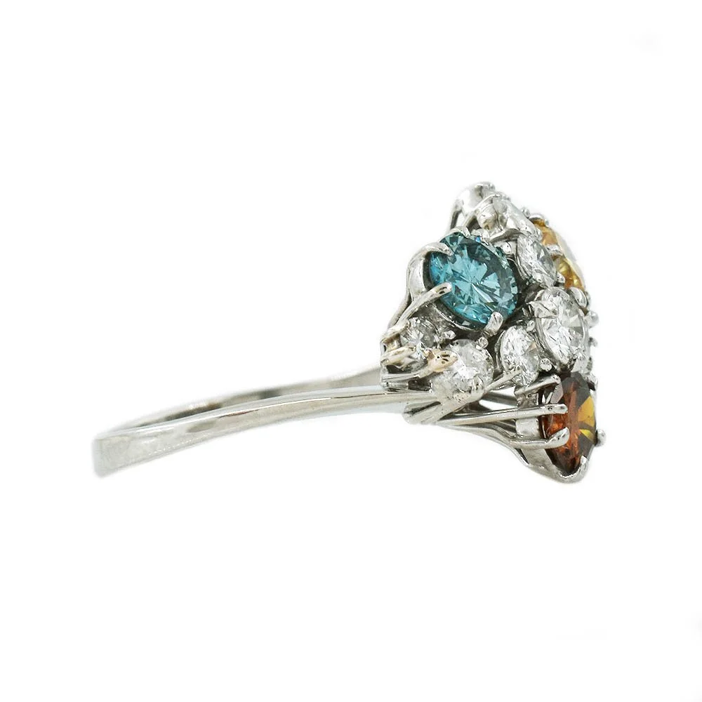 Featuring colored diamonds, this ring is full of sass and bling! One each of blue, yellow and cognac irradiated diamonds are playfully separated by curves of white diamonds. Radiation is commonly used to change the color of natural gemstones to create a variety of beautiful colors.