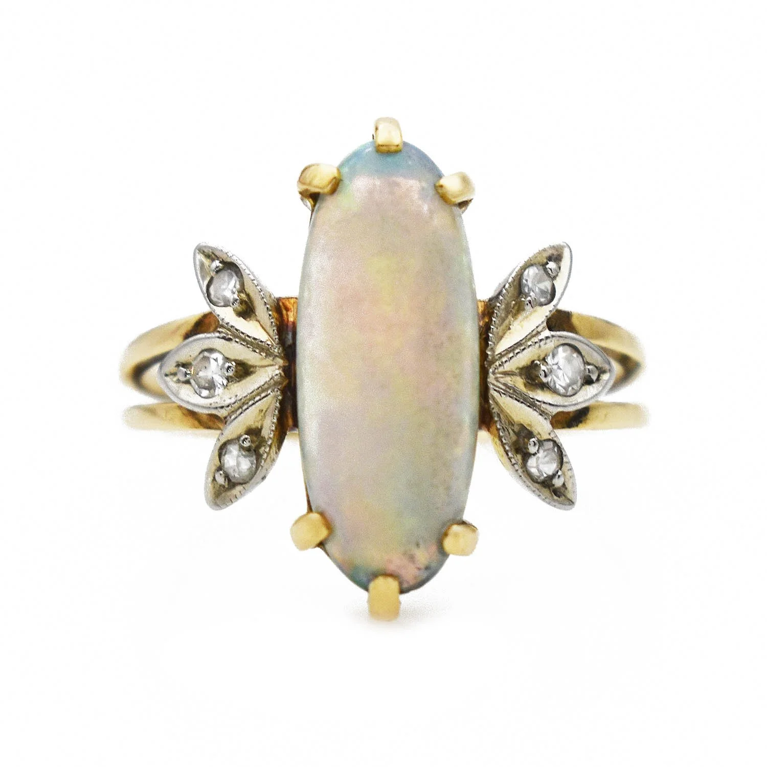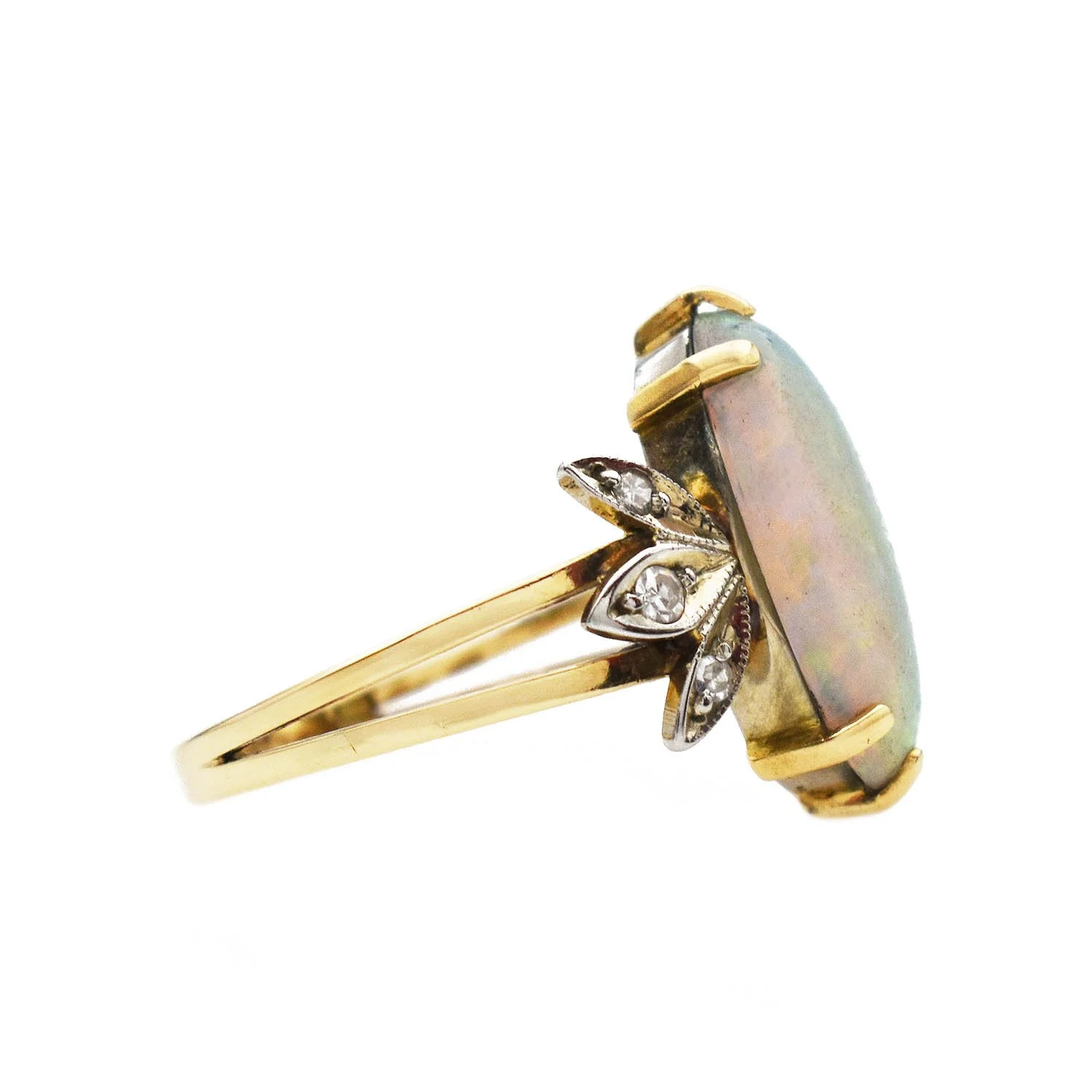 An elongated oval opal flashing all the colors of the rainbow is accented on either side with white gold, crown-like "leaves" set with diamonds. The opal shows some signs of wear, conveying that in its previous life, it was well loved and worn often. Time for you to take it on its next journey!