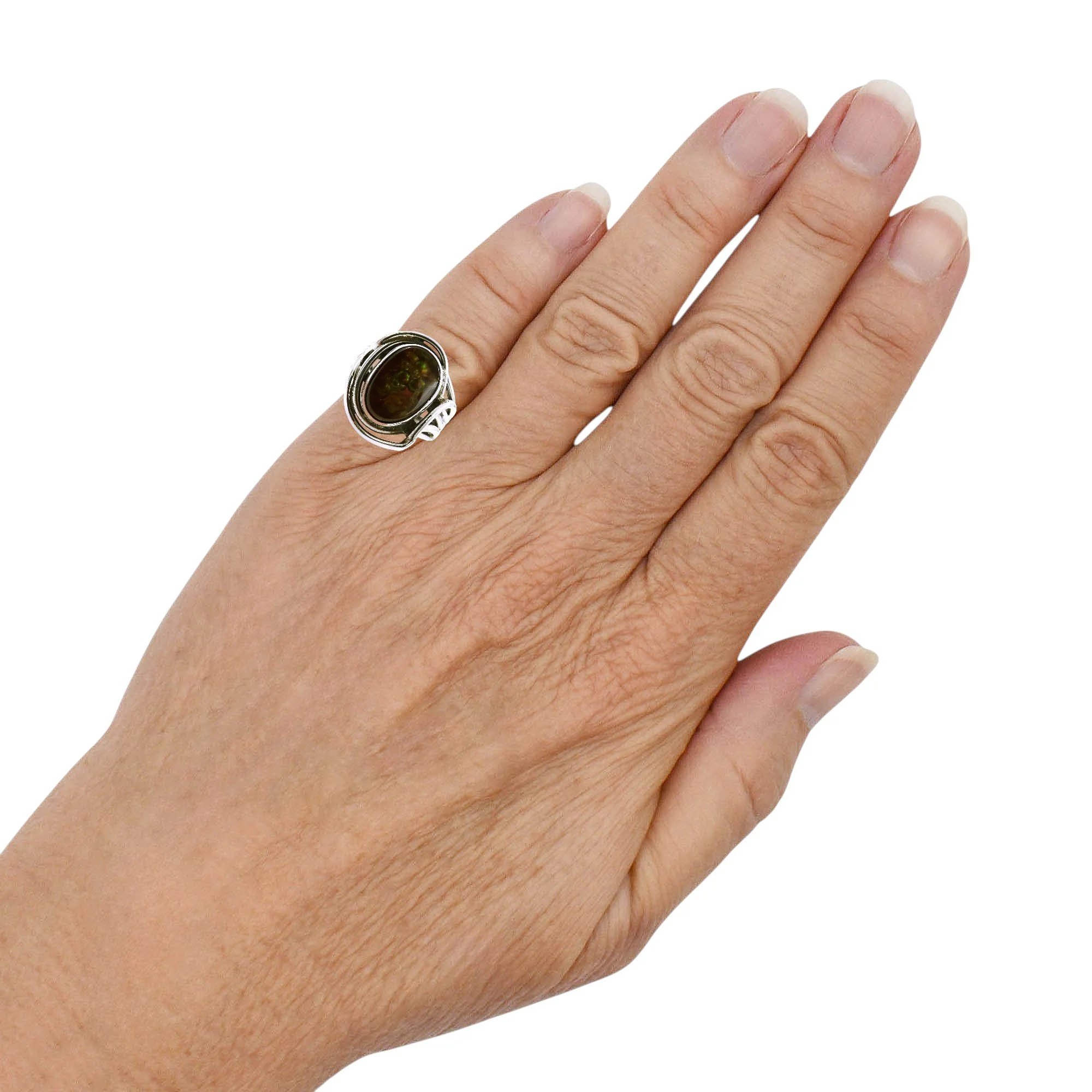 Fire agate has a mysterious, interior bubbly structure, dancing with subtle colors. The oval fire agate in this ring is set in a free form, asymmetric design.