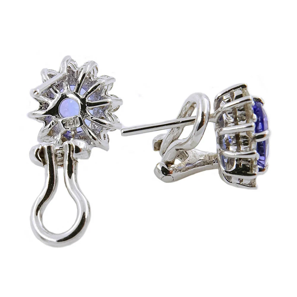 Brilliant blue-purple tanzanite surrounded by diamonds are the stars of the show in these masterpiece earrings. Indulge yourself with these staples of the jewelry box. The omega backs makes them comfortable and secure.