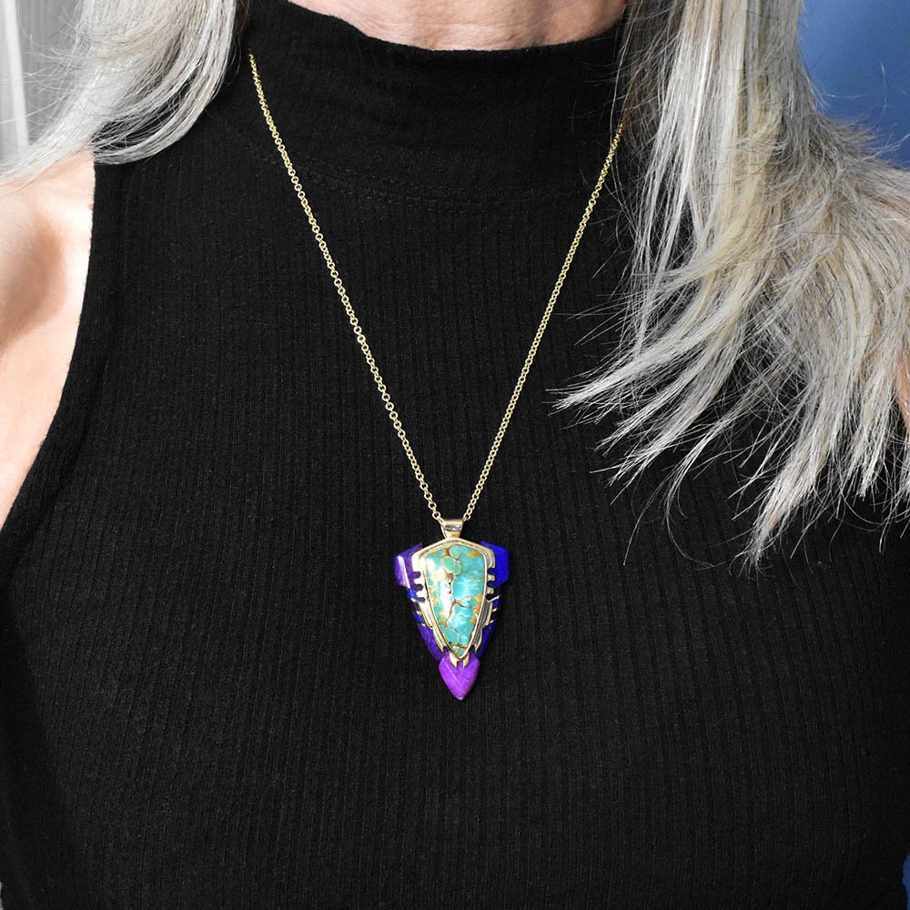 An exquisite example of his early work, this Raoul Sosa handmade turquoise, lapis and sugilite pendant showcases his attention to detail and masterful craftsmanship. While hand cut gemstones are cut to resemble the shape of an arrowhead, the pendant has elements of Southwest style expressed in the gold accenting.