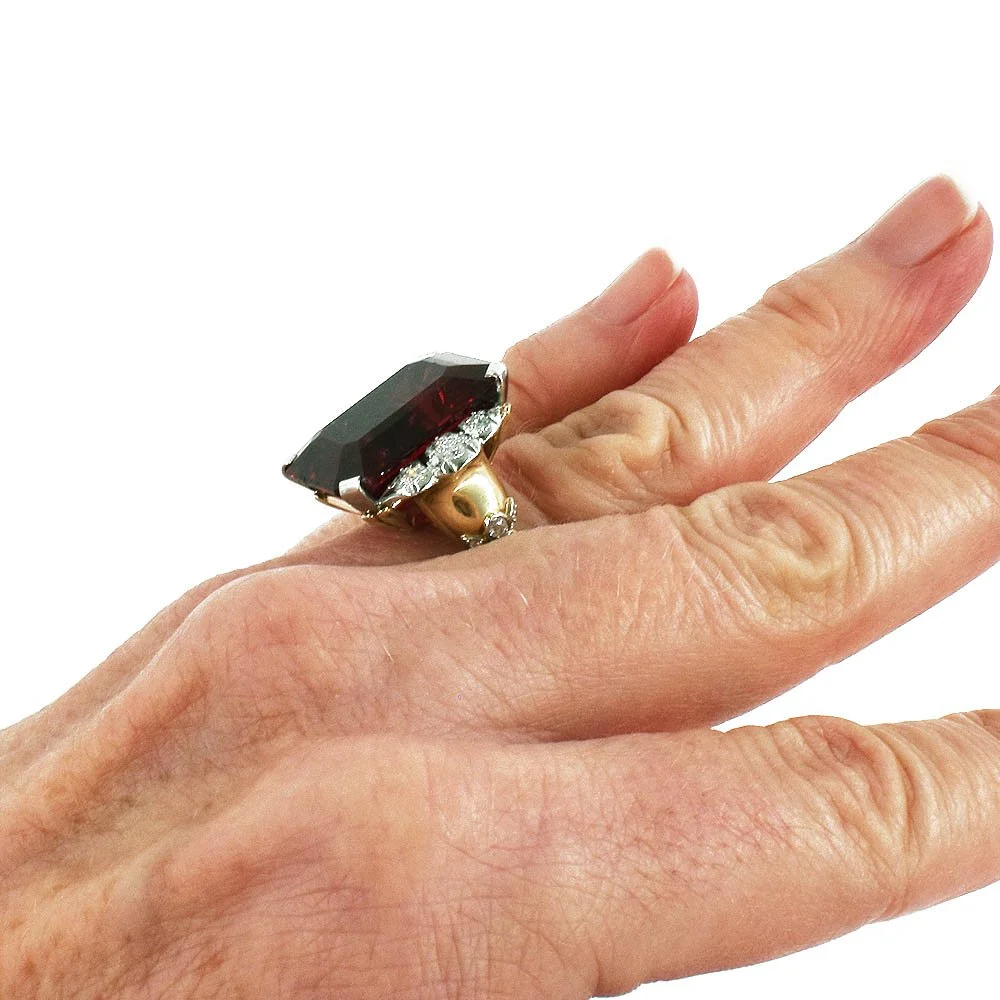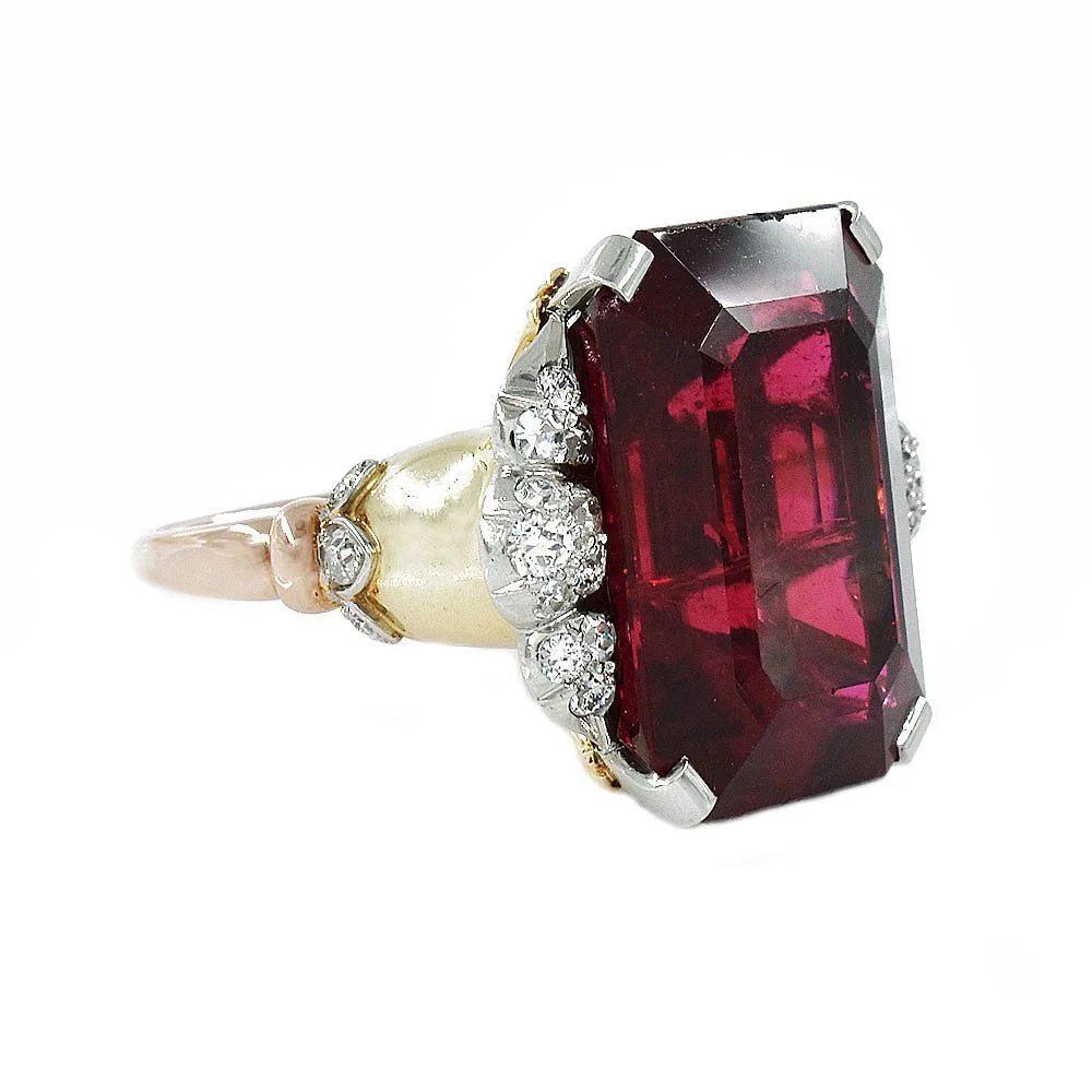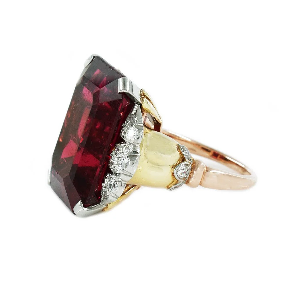 This giant Rubellite tourmaline is over 23 carats of glorious royal red opulence set in three metal colors, accented discretely with diamonds. Rubellite is the rarest gem in the tourmaline family, and is occasionally mistaken for ruby. With a very retro style, this ring is more than a statement, it’s a triumph!