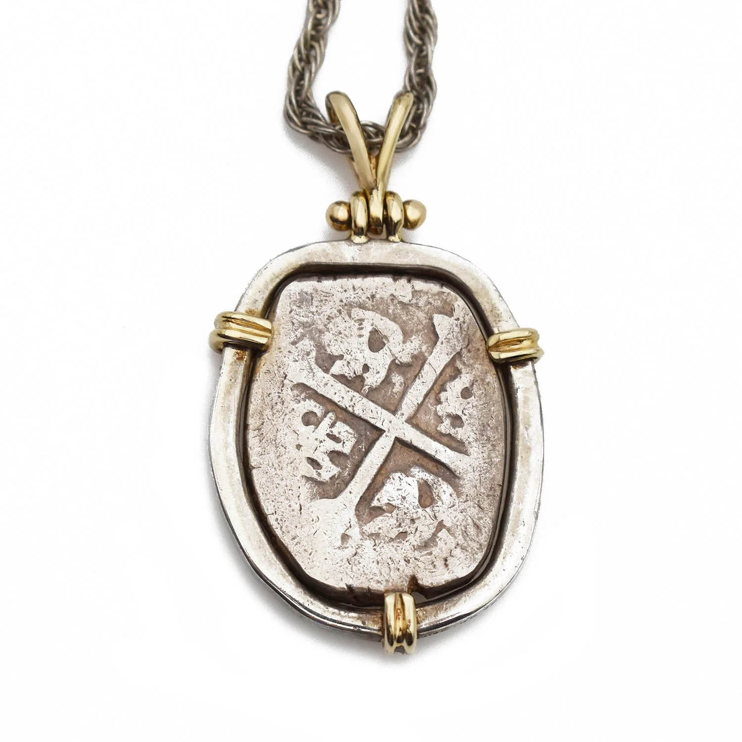 A Spanish cob is set in a sterling silver frame and secured with gold prongs in this vintage pendant with silver rope chain included. Indulge your passion for jewelry and history with this intriguing piece of history!