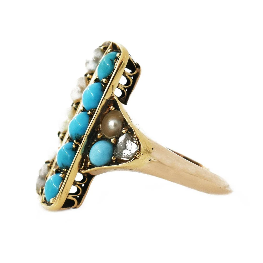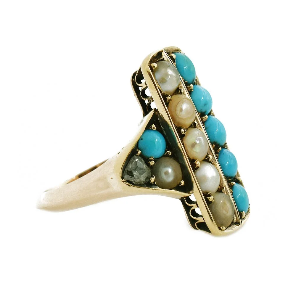 With a rectangle of two rows of 5, round pearls on one side and round turquoise on the other, this ring has antique charm. Triangles filled with a pearl, turquoise cabochon and an Old Mine cut diamond accent each side to add a hint of sparkle. This Victorian (1837 - 1901) ring makes a statement of simpler times. Not to be worn every day, adorn yourself with it on special occasions, or for nights out on the town.